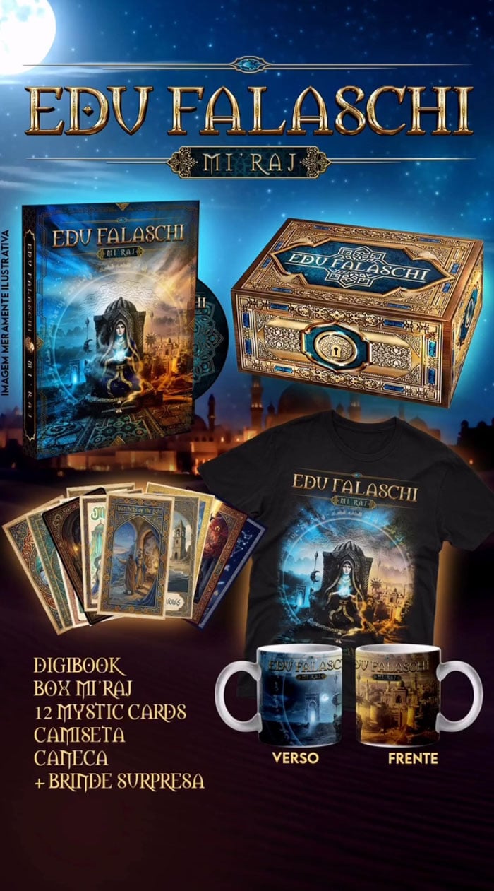 O box exclusivo e limitado de "Mi'raj" já pode ser encomendado pelos fãs, contendo a versão do álbum em digibook, camiseta, caneca, brinde surpresa e 12 Mystic Cards colecionáveis. Para adquirir, acesse a lojinha oficial do Edu Falaschi.