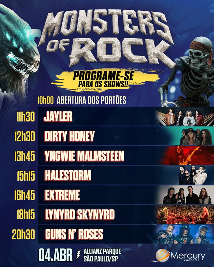 A organização do Monsters of Rock confirmou a ordem dos shows para a edição 2026 do evento. O festival acontece no próximo dia 4 de abril, no Allianz Parque, em São Paulo. Os portões serão abertos às 10h, com as atrações subindo ao palco nos seguintes horários: