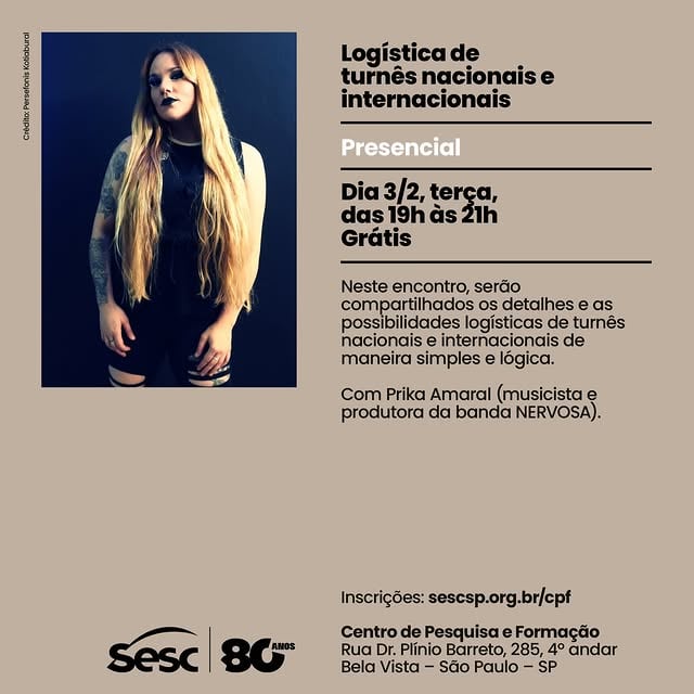 O evento ocorreu dentro do espaço do CPF Sesc, no prédio do Sesc 14 Bis, na capital paulista. Neste encontro, a natural de Bragança Paulista compartilhou a sua vivência sobre a gestão de logística em turnês nacionais e internacionais, ministrando tópicos os quais a própria passou durante a sua posição ao construir a sua principal filha: a NERVOSA.