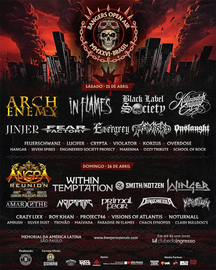 A organização do Bangers Open Air divulgou o cartaz oficial do festival, que será realizado entre os dias 25 e 26 de abril, no Memorial da América Latina, em São Paulo. A nova arte, reproduzida a seguir, traz os nomes de Arch Enemy, Krisiun e Ambush, que substituem Twisted Sister, Eluveitie e Cobra Spell.