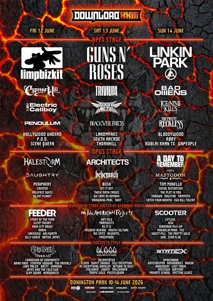 A organização do Download Festival anunciou novas atrações para o cast da edição 2026. Os shows também foram divididos entre os três dias do evento, que acontece em 12, 13 e 14 de junho no autódromo Donington Park – onde a versão original do Monsters of Rock aconteceu entre 1980 e 1996.