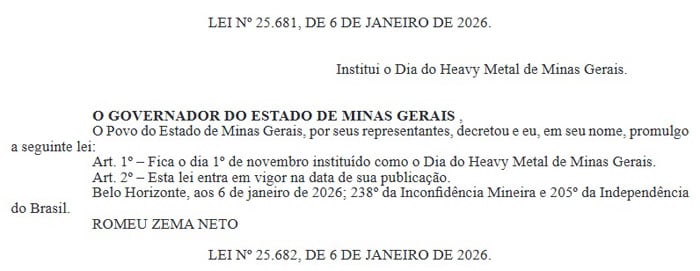 O estado de Minas Gerais, historicamente reconhecido como um dos berços do metal na América Latina, oficializou sua ligação com o gênero. O governador Romeu Zema sancionou a lei que insere oficialmente no calendário estadual o "Dia do Heavy Metal de Minas Gerais", a ser celebrado anualmente em 1º de novembro.