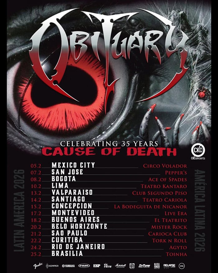 A lendária banda norte-americana de death metal Obituary confirmou o reagendamento de sua turnê latino-americana. A tour, que celebra o marco de 35 anos do clássico álbum "Cause of Death" (1990), havia sido adiada, mas agora tem novas datas confirmadas para fevereiro de 2026. O giro passará por cinco capitais brasileiras: Belo Horizonte, São Paulo, Curitiba, Rio de Janeiro e Brasília.