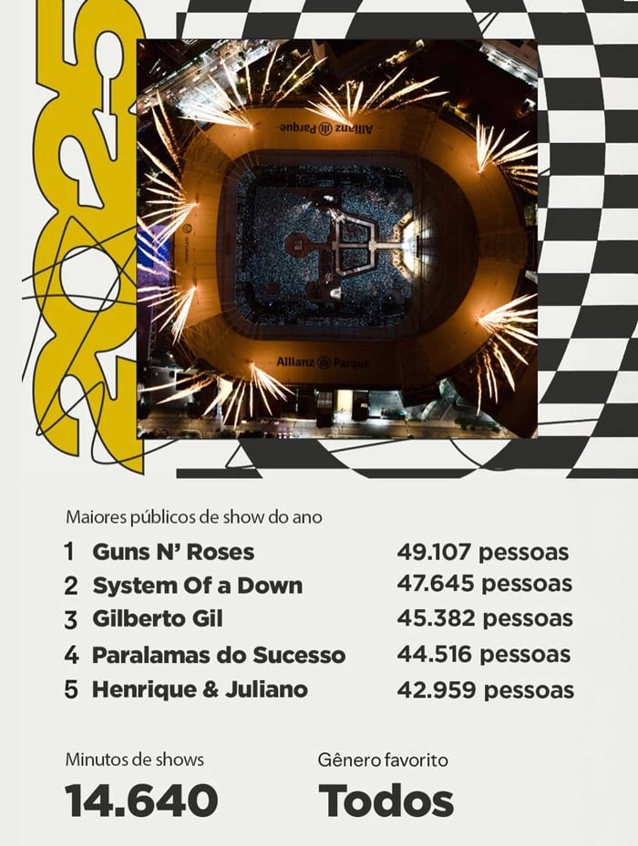 A administração do Allianz Parque, em São Paulo, publicou um Top 5 com os shows de maior público no local em 2025. Apesar de críticas sobre o excesso de passagens do Guns N' Roses pelo Brasil, a banda de Axl, Slash e Duff mostrou mais uma vez a sua força, cravando a plateia mais numerosa do ano no local, com 49.107 presentes.