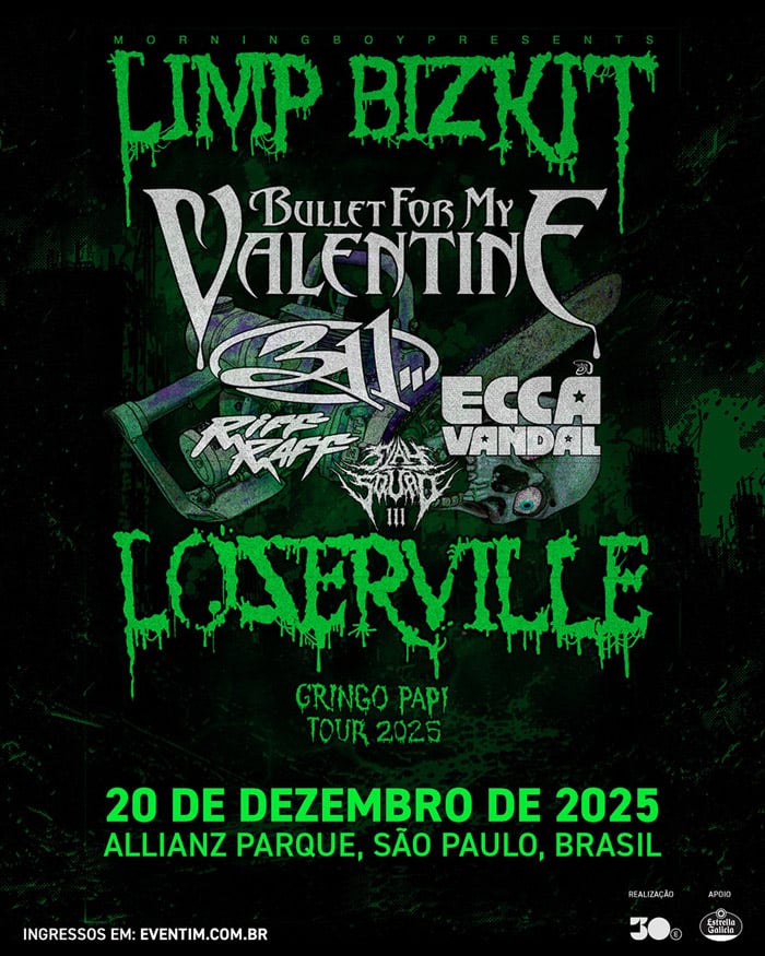 O Bullet For My Valentine foi anunciado como atração do show do Limp Bizkit em São Paulo. A apresentação acontece dia 20 de dezembro, no Allianz Parque. A banda galesa aparece no espaço do cartaz que antes pertencia ao cantor Yungblud. Até o momento da publicação desta matéria, não houve uma explicação para a mudança.
