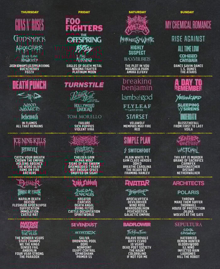 A programação conta com quatro dias recheados de atrações de diferentes estilos. Dentre as bandas confirmadas estão Guns N' Roses, Foo Fighters, Bring me the Horizon e My Chemical Romance. Vale destacar que o Sepultura também está no line-up representando o Brasil.