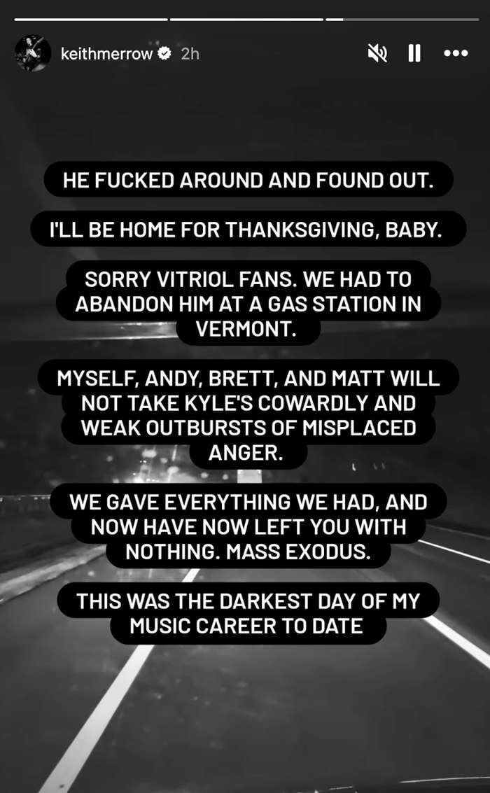 A informação foi confirmada pelo agora ex-guitarrista Keith Merrow, que se retirou junto com o baixista Brett Leier e o baterista Andy Vincenzetti. Em um story no Instagram, o instrumentista expôs a raiva e contou a história ao público.