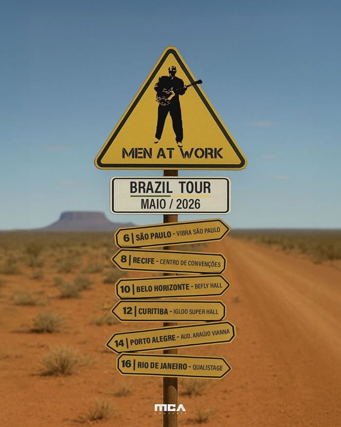O Men at Work confirmou uma turnê brasileira com 6 shows para maio de 2026. Atualmente, a banda australiana é uma extensão da carreira solo de seu líder, o vocalista e guitarrista Colin Hay. Ao vivo, ele é acompanhado por San Miguel Perez (guitarra), Yosmel Montejo (baixo), Jimmy Branly (bateria), Rachel Mazer (saxofone e teclados) e Cecilia Noël (backing vocals). As datas podem ser conferidas abaixo.