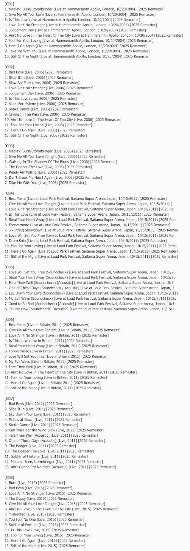 Sai dia 25 de abril, via Rhino Records, o box-set "Access All Areas: Live". A caixa reúne, em 8 CDs, todos os álbuns ao vivo gravados pelo Whitesnake no século atual. São eles: "Live... in the Still of the Night" (2006), "Live... in the Shadow of the Blues" (2006), "Made in Japan" (2013), "Made in Britain/The World Record" (2013) e "The Purple Tour" (2018). O tracklist completo pode ser conferido logo abaixo.