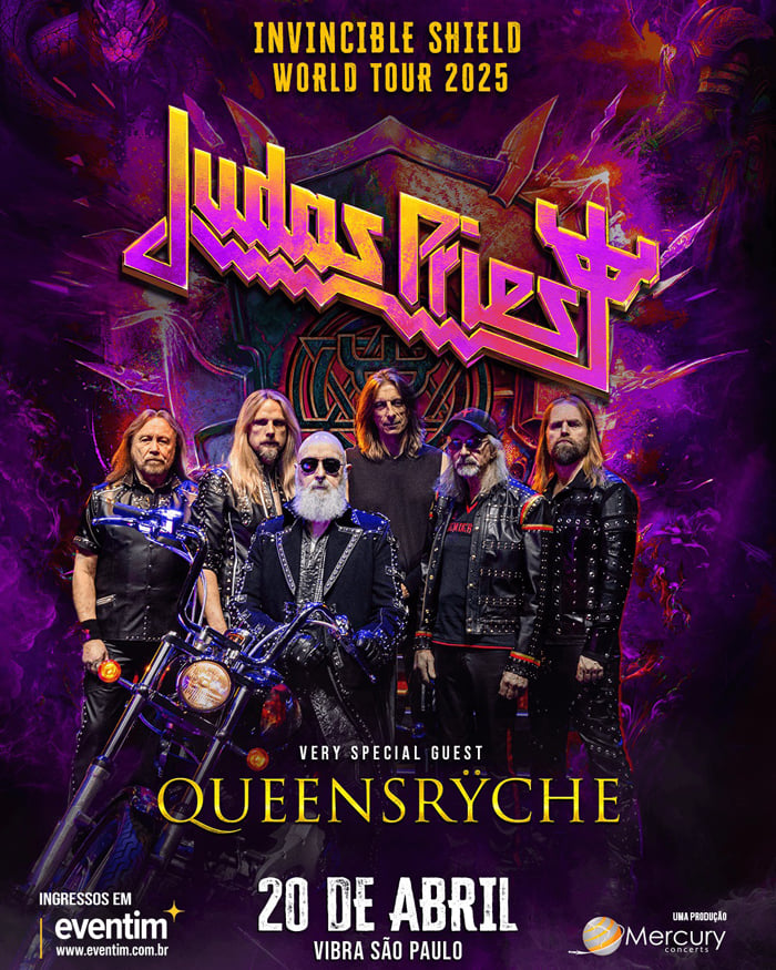 A banda de Rob Halford trará a turnê "Shield of Pain" ao país. O giro segue divulgando o álbum mais recente, "Invincible Shield" (2024), além de celebrar os 30 anos do clássico "Painkiller" (1990).