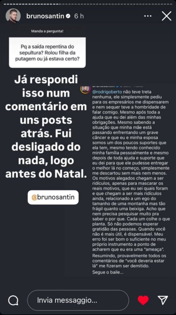 Na sessão de comentários de outra postagem, conforme repercutido pelo Sepultura Community e RockBizz, Bruno deixou claro sentir que foi visto como uma "ameaça" por ser "bom demais", em um recado que parece ter como alvo o atual titular das baquetas na banda, o americano Greyson Nekrutman.
