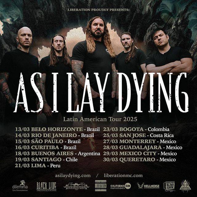 A banda norte-americana As I Lay Dying, um dos nomes mais conhecidos do metalcore, anunciou sua volta à América Latina em março de 2025, com quatro shows no Brasil. O grupo, que está na estrada há quase 25 anos, passará por Belo Horizonte (13/03), Rio de Janeiro (14/03), São Paulo (15/03) e Curitiba (16/03), antes de seguir para outros países da região.