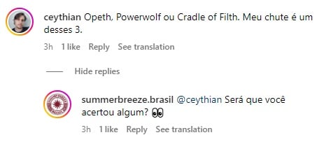 Nos comentários da postagem, uma das bandas mais pedidas foi o grupo alemão Powerwolf. Um fã, Gustavo Gomes, comentou: "Opeth, Powerwolf ou Cradle of Filth. Meu chute é um desses 3", sendo respondido pelo perfil do festival com a seguinte mensagem: "Será que você acertou algum?"