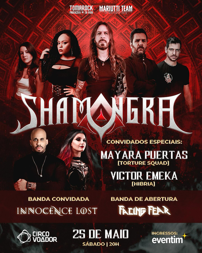 Depois de uma primeira apresentação absolutamente bem sucedida em São Paulo, o Shamangra agora leva seu espetáculo para o palco do Circo Voador, no Rio de Janeiro-RJ, desta vez contando em sua formação com Luis Mariutti no baixo, Hugo Mariutti na guitarra, além das jovens e talentosíssimas Hanna Paulino (Vocal) e Helena Nagagata (Guitarra), e a participação especial dos cantores May Puertas (Torture Squad), Victor Emeka (Hibria), Mari Torres (Innocence Lost) e Thiago Millores.