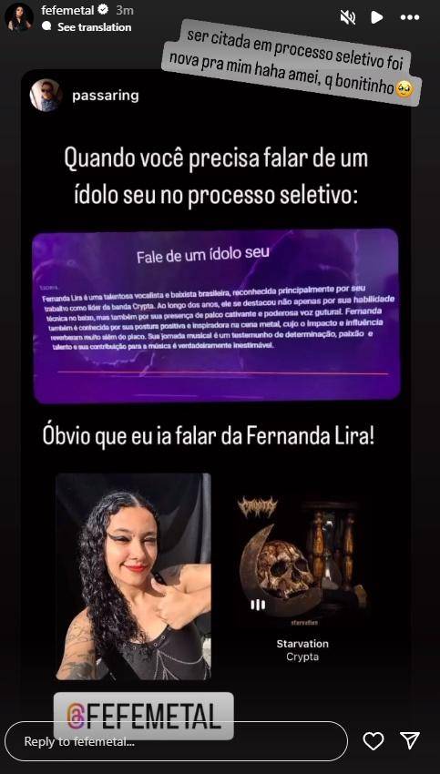 Fernanda Lira, vocalista e baixista da Crypta, compartilhou em seu perfil no Instagram um story mostrando que foi citada em um processo seletivo.