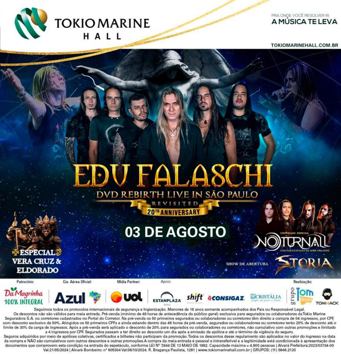 Edu Falaschi tem o prazer de anunciar um evento imperdível para os fãs de metal. Em uma celebração marcante dos 20 anos do lançamento do icônico DVD "Rebirth Live in São Paulo", do Angra, além de um especial dos seus discos solo Vera Cruz e Eldorado, Falaschi está programado para incendiar o palco do prestigiado Tokio Marine Hall, em São Paulo, no dia 3 de agosto de 2024.