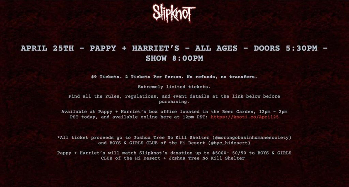 O Slipknot lançou o YouCantKillMe.com, uma página misteriosa e com design que remete aos sites do final dos anos noventa. Após fãs acharem referências ao dia 25 de abril e um outdoor da banda na Califórnia, tudo levava a crer que haveria um show surpresa.