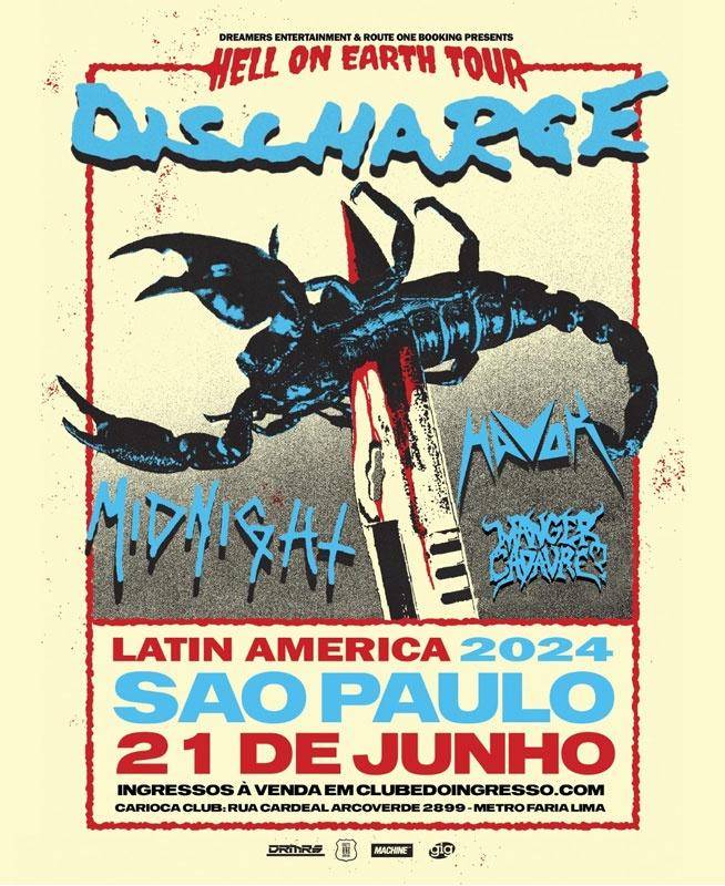 A lenda viva do punk mundial Discharge retorna à América Latina em junho deste ano — são datas remarcadas da turnê que aconteceria em novembro de 2023. No Brasil, o único show acontece em São Paulo no dia 21 de junho, agora no Carioca Club, e com mais três bandas convidadas, duas delas internacionais: Havok (thrash metal, EUA), Midnight (black/speed metal, EUA) e a paulistana Manger Cadavre? Os ingressos estão à venda no site do Clube do Ingresso e os ingressos antes adquiridos em outra ticketeira ainda estão valendo.