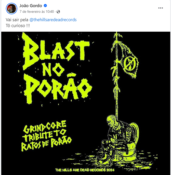 João Gordo usou suas redes sociais para divulgar o lançamento de um tributo ao RATOS DE PORÃO que contará somente com bandas de grindcore, o "Blast No Porão - Grindcore Tribute To RATOS DE PORÃO".