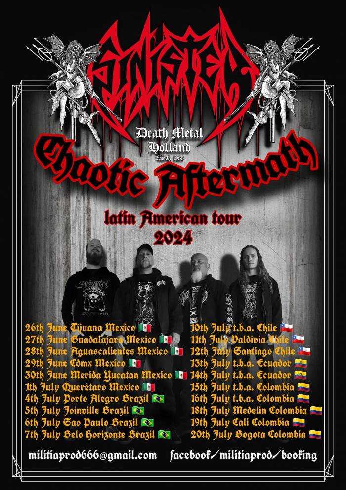 O veterano grupo holandês de death metal SINISTER incluiu o Brasil no calendário da sua nova turnê, batizada de "Chaothic Aftermath", que terá uma longa passagem pela América do Sul, incluindo México, Brasil, Chile, Equador e Colômbia.