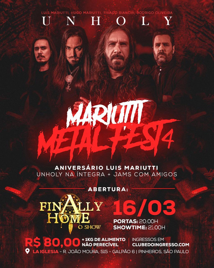 No próximo dia 16 de Março, o lendário baixista brasileiro, Luis Mariutti (Sinistra, ex-Angra, ex-Shaman), irá celebrar seu aniversário de 53 anos com a 4ª edição do já clássico Mariutti Metal Fest, onde tocará na íntegra o seu recém lançado álbum solo, "Unholy", contando com a participação de Hugo Mariutti (Guitarra), Thiago Bianchi (Vocais) e Rodrigo Oliveira (Bateria), além de várias jams tocando com amigos e músicos consagrados do cenário nacional.