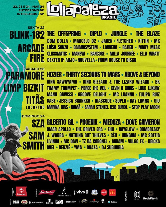 O line-up, anunciado pelos perfis oficiais do Lollapalooza, revelou um verdadeiro banquete musical para os fãs. O primeiro dia, 22 de março, será liderado por duas gigantes do cenário internacional: Blink-182 e Arcade Fire. Já no segundo dia, Paramore, Limp Bizkit e o encontro especial do Titãs prometem agitar o público. O encerramento do festival ficará por conta de SZA e Sam Smith, no dia 24 de março. Além dos headliners, o Lollapalooza 2024 contará com apresentações de artistas renomados como Thirty Seconds To Mars, Diplo, Dove Cameron, Gilberto Gil, Kevin O Chris, Luísa Sonza, Marcelo D2 e Manu Gavassi.