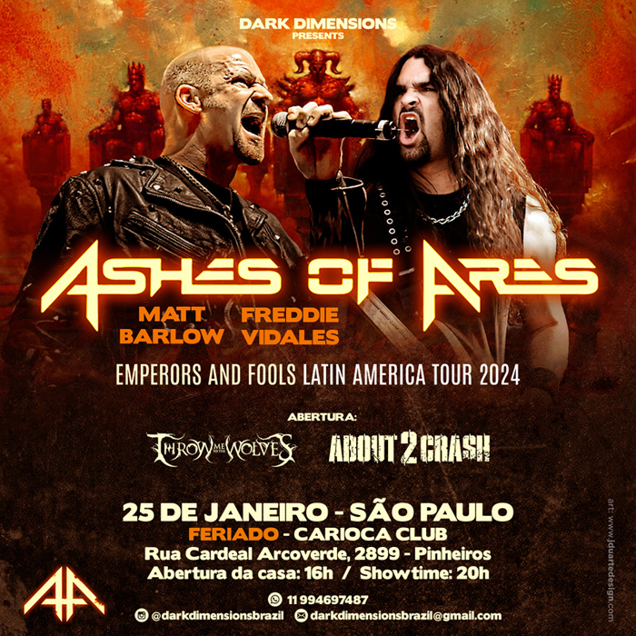 A produtora Dark Dimensions orgulhosamente apresenta: Ashes Of Ares, a voz e a alma do Iced Earth, pela primeira vez no Brasil! Formado em 2012 pelos ex-membros do Iced Earth, Matthew Barlow (vocal) e Freddie Vidales (guitarra/baixo), juntamente com o ex-baterista do Nevermore, Van Williams, o Ashes of Ares surgiu com a ambição de criar um som genuíno, fruto da verdadeira colaboração de suas influências, ideias e visões pessoais.