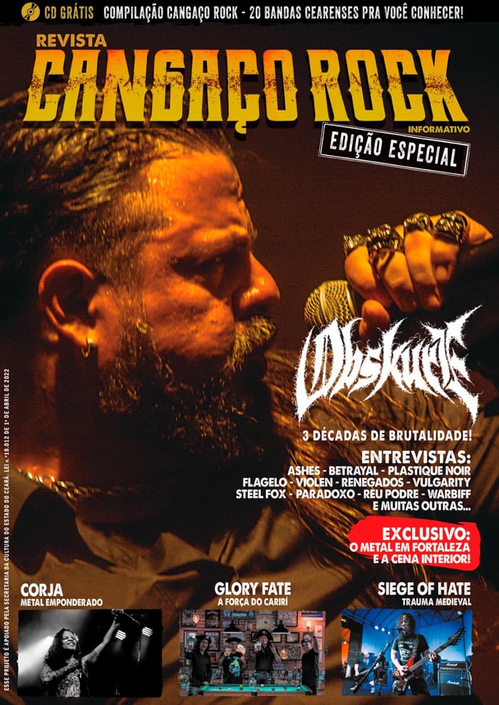 Será lançada a aguardada Edição Especial do Cangaço Rock Informativo, uma revista com 76 páginas coloridas, de formato exclusivo e totalmente focada na efervescente cena underground do Ceará. Esse projeto vibrante oferece um conteúdo editorial ousado, com uma coletânea em CD físico com vinte bandas locais, que prometem incendiar seus ouvidos. São entrevistas com dezenas de bandas, matérias sobre a formação da cena local, e artigos sobre cultura, diversidade, inclusão e acessibilidade. No destaque da capa, está a veterana OBSKURE e também as bandas CORJA, GLORY FATE e S.O.H.