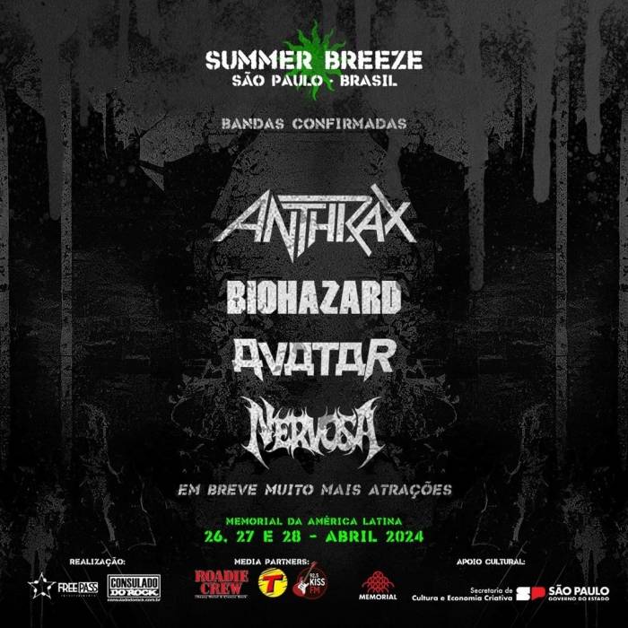 A organização do Summer Breeze confirmou mais quatro bandas para a edição de 2024 do festival, a saber: Anthrax, Biohazard, Avatar e Nervosa.