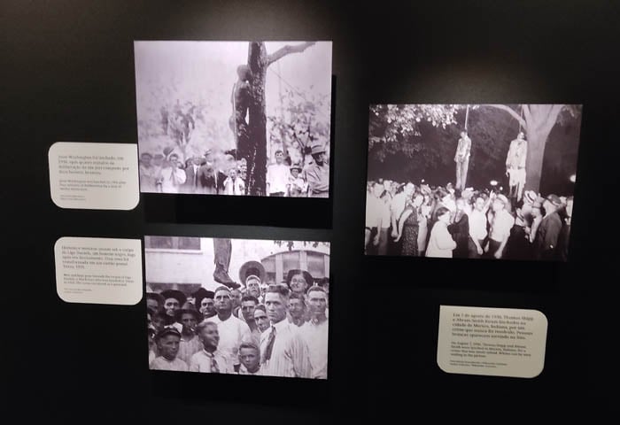 No começo da exposição, logo de cara, um choque que já dá o tom do que está por vir: uma porta preta para negros e uma branca para brancos, e nenhuma instrução. A porta branca dá em um cubículo com mensagens sobre a segregação racial e uma placa hoje chocante, mas antigamente comum no sul dos Estados Unidos — sua região mais racista —, que diz: "Proibido negros, mexicanos e cachorros."