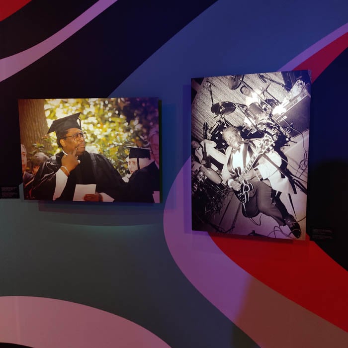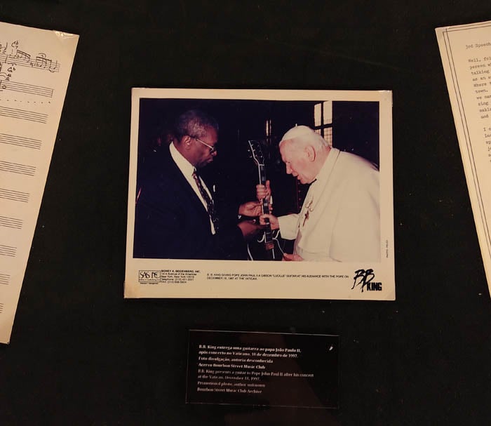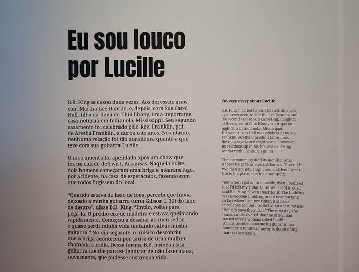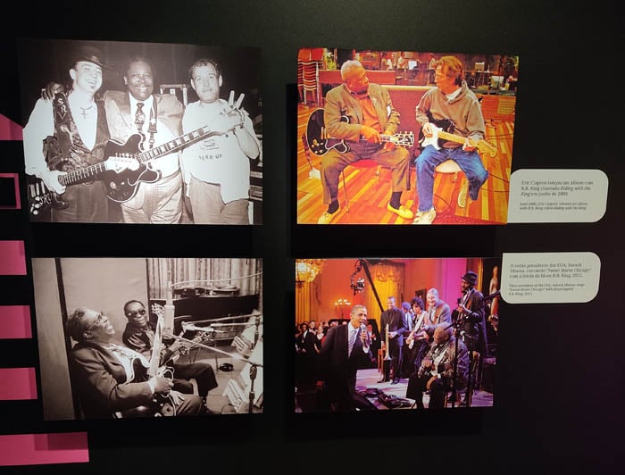 Entre os itens exibidos estão imagens do acervo do B.B. King Museum, credenciais de suas turnês pelo Brasil, instrumentos, roupas e prêmios — como o Grammy faturado por ele em 1971. Começando pelo fim, na saída, quando eu estava chamando um Uber (o MIS não tem metrô perto), um cara entrando com uma moça viu a logo da exposição e perguntou a ela "O que Bebê King?"