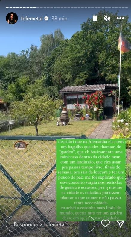 "Descobri que na Alemanha eles têm um bagulho que eles chamam de 'garden', que é basicamente uma mini casa dentro da cidade mesmo, com um jardinzão que eles usam para passar tempo livre, final de semana, pra sair da loucura e ter um pouco de paz.