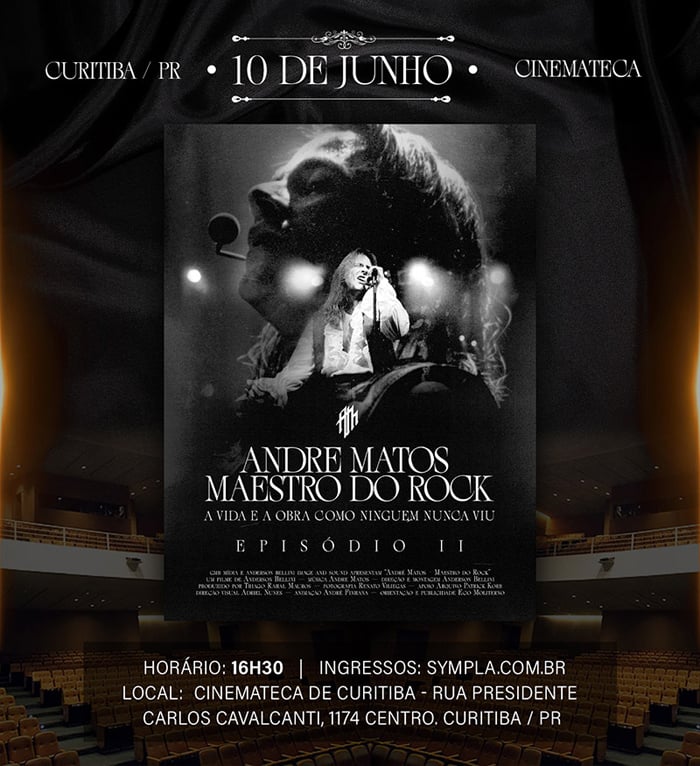 Andre Matos – Maestro do Rock chega a Curitiba no dia 10 de junho (sábado), em duas sessões: às 16h30 e às 19h30, ambas na Cinemateca (Rua Presidente Carlos Cavalcanti, 1174), região central da cidade. Os ingressos custam 35 reais (meia e promocional, mediante doação de 1 quilo de alimento não perecível ou ração para cães ou gatos) e estão à venda pela plataforma Sympla.