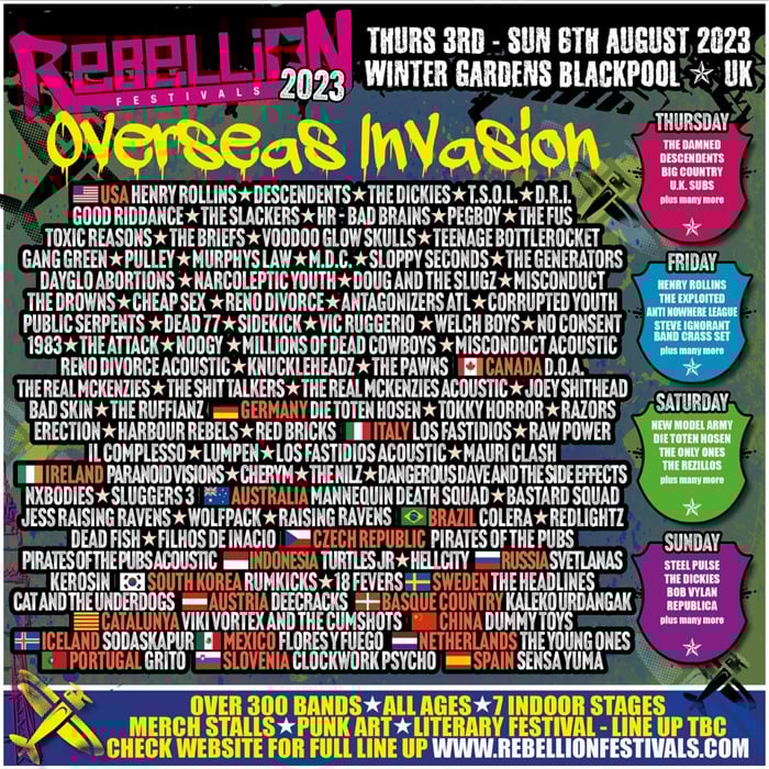 Considerado o maior festival de música/arte punk do mundo, o Rebellion vai acontecer entre os dias 3 a 6 de agosto, em Winter Gardens, Blackpool, no Reino Unido. Serão mais de 300 bandas em sete palcos diferentes, sendo 95 bandas de vinte e dois países diferentes.