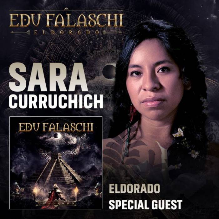 Edu Falaschi acaba de anunciar a primeira participação especial de "Eldorado", seu novo álbum de estúdio que tem previsão de lançamento para agosto de 2023. Sara Curruchichi é a primeira convidada anunciada pelo cantor e compositor. Sara Curruchich é uma cantora e compositora indígena guatemalteca que mantém vivas as raízes mais profundas da América Latina, cantando suas canções em Kaqchikel, sua língua materna, originária da civilização Maia, que surgiu no México a cerca de 2500 anos antes de Cristo.