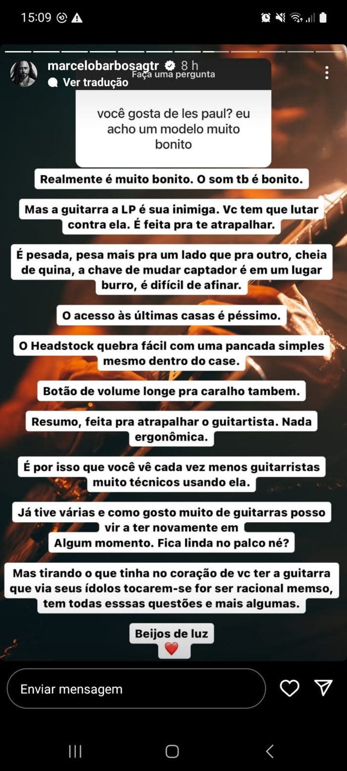 "Realmente é muito bonita. O som também é bonito. Mas a guitarra Les Paul é sua inimiga. Você tem que lutar contra ela. É feita para te atrapalhar. É pesada, pesa mais para um lado que para o outro, cheia de quina. A chave de mudar captador é em um lugar burro, é difícil de afinar.