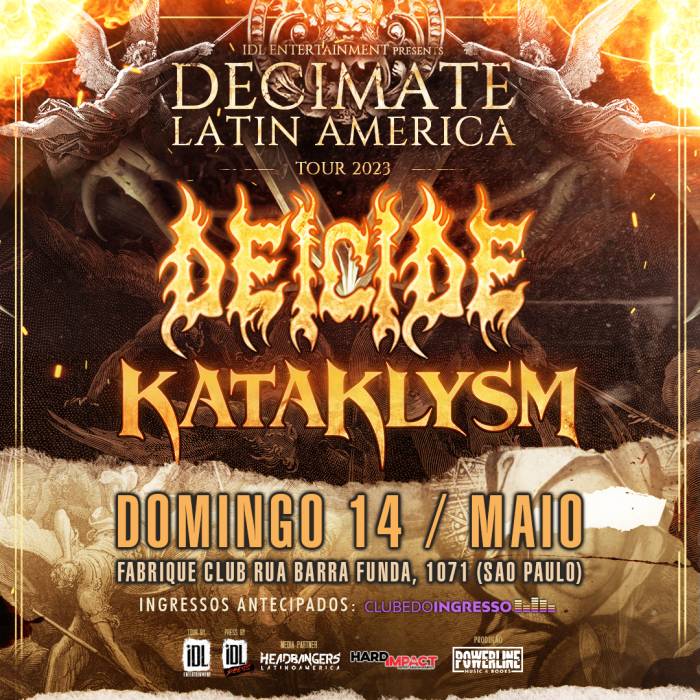 As bandas Deicide e Kataklysm, dos nomes colossais do death metal mundial, vão se apresentar em conjunto em um show no dia 14 de maio, domingo, em São Paulo. A apresentação, com produção da Powerline, é parte da turnê latino-americana da banda, que passará por 10 países do continente, com realização da IDL Entertainment. O show único no Brasil será na Fabrique Club, em São Paulo, e os ingressos já estão a venda a partir de 160 reais no site Clube do Ingresso.