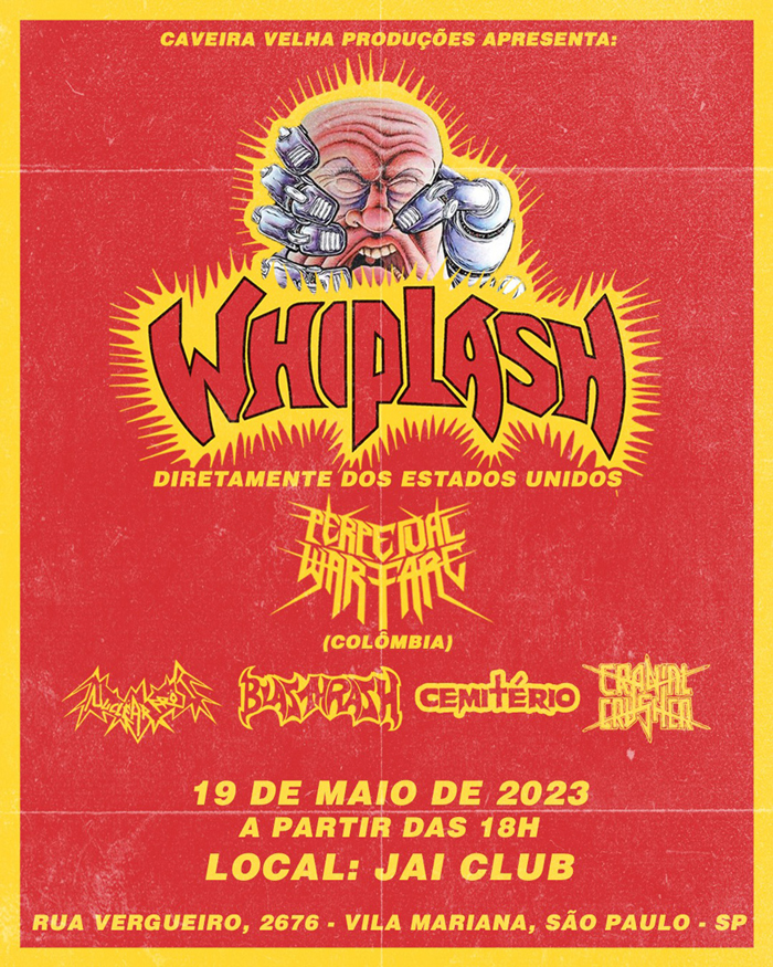 Referência do thrash metal, a banda americana Whiplash retornará ao Brasil para um show único agendado para o dia 19 de maio na Jai Club, em São Paulo (SP). O evento, que terá início a partir das 18h, contará ainda com a presença da banda colombiana Perpetual Warfare e das brasileiras Cemitério, Blasthrash, Nuclear Frost e Cranial Crusher.