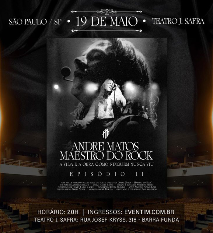 O segundo episódio do Documentário Andre Matos – Maestro do Rock será exibido em única apresentação no dia 19 de maio, no Teatro J.Safra, em São Paulo e as vendas dos ingressos começam nesta sexta-feira, 19, no site da Eventim.