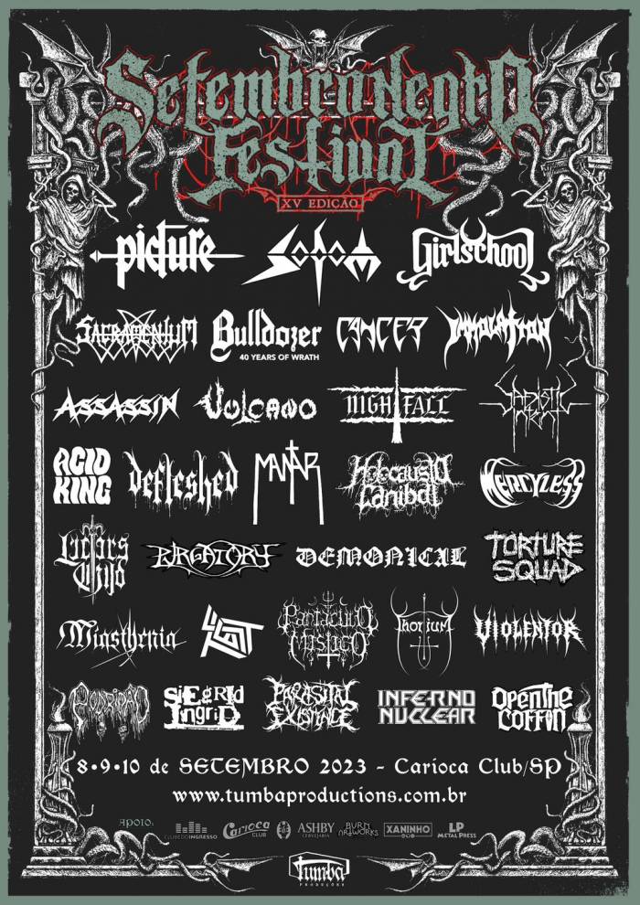 A organização do Setembro Negro Festival anunciou nesta segunda-feira (20 de fevereiro) a "escalação" do evento, que acontecerá entre os dias 8 e 10 de setembro, no Carioca Clube, lozalizado em São Paulo. Sodom, Girschool e Picture são as headliners do festival.