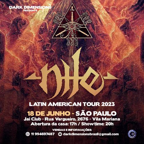A lenda norte-americana de brutal technical death metal, Nile, anunciou para o mês de junho sua turnê latino-americana, que passará pela capital paulista em um único show, dia 18 de junho, na Jai Club, localizada na Vila Mariana, com produção/realização da produtora Dark Dimensions.