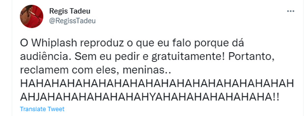 Regis, percebendo que abrira a caixa de pandora, retrucou alguns comentários e em outros apenas mandou um gigantesco HAHAHAHAHAHAHAHAHA. E num dos posts, onde o Whiplash.net foi citado, ele explicou porque sempre aparece no site.