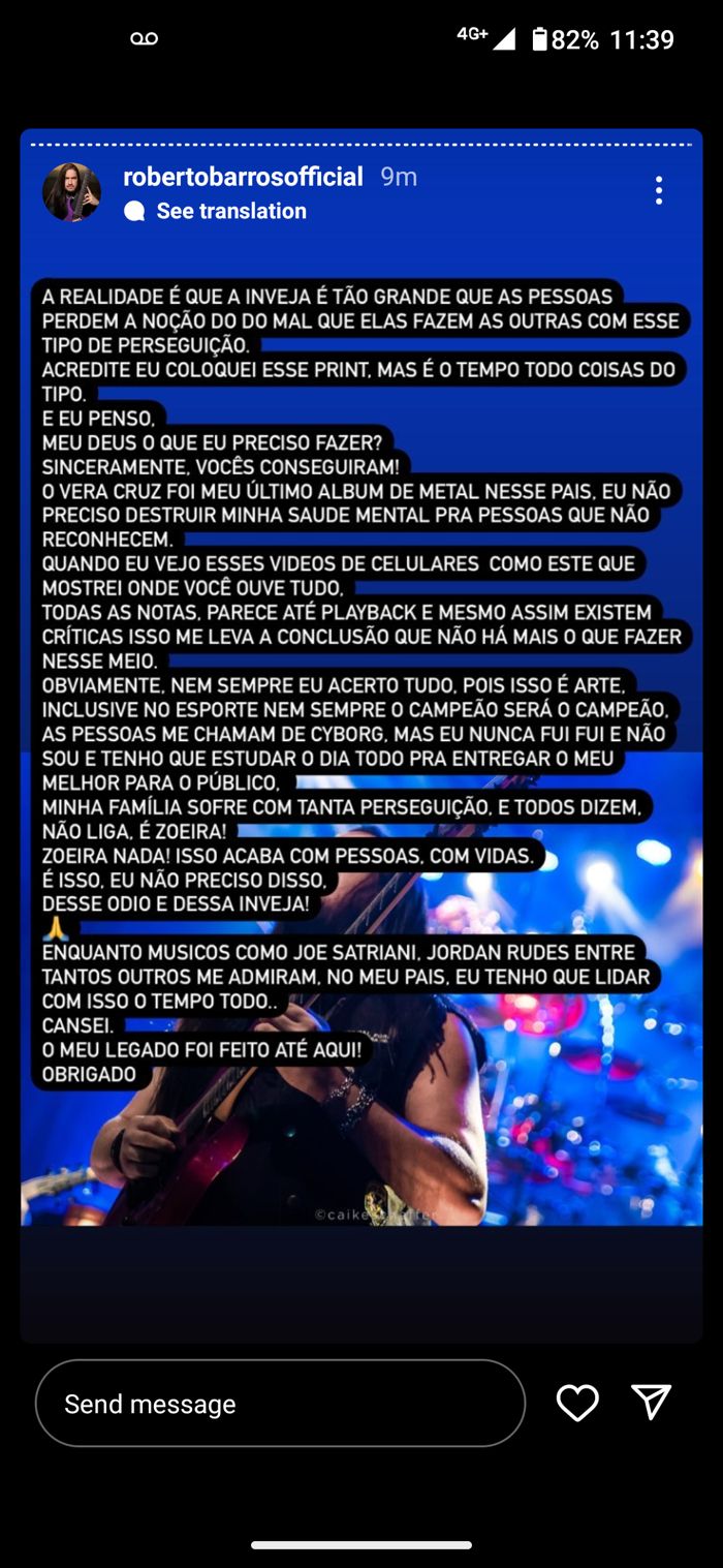 O guitarrista e compositor Roberto Barros, conhecido por ser componente da banda solo de Edu Falaschi, anunciou, por meio do Instagram Stories, sua "aposentadoria do metal no Brasil".