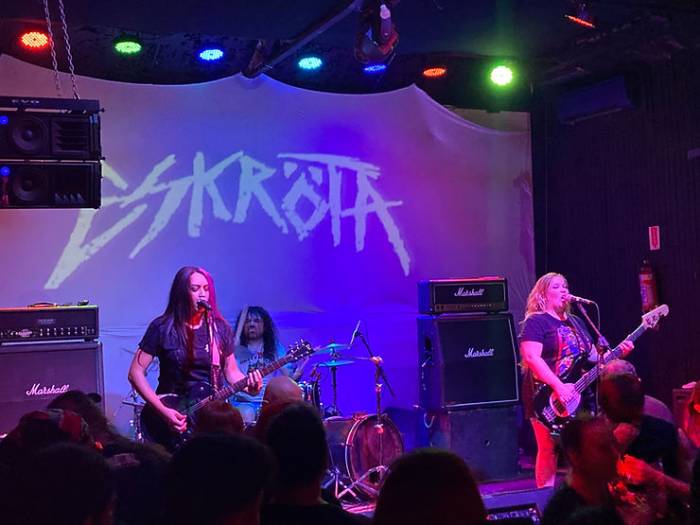 Logo após, subiu ao palco a Eskröta, também de SP, banda que vem se destacando no underground nacional, tendo feito apoteóticas apresentações em dois dos maiores festivais de música do Brasil: o Rock in Rio e o Knotfest. O som se resume num crossover rápido e violento, que não deixou a galera nem respirar direito. Fizeram um excelente show sob o comando de sua vocal e guita, Yasmin Amaral.