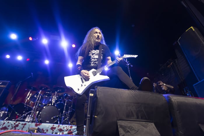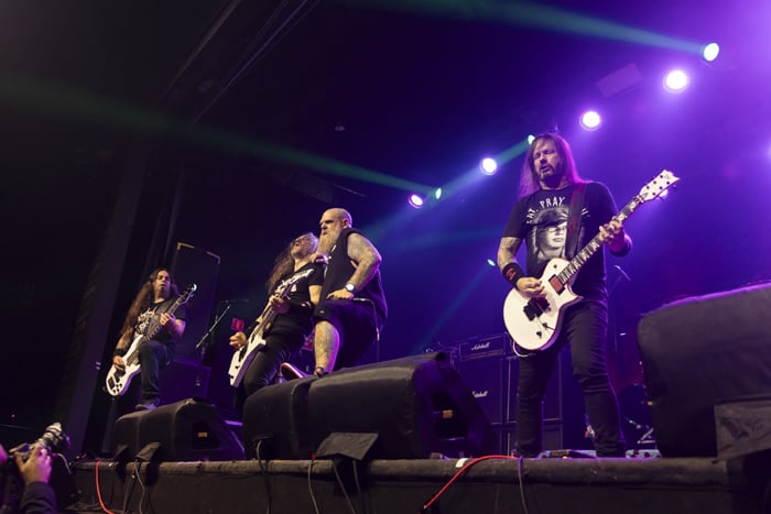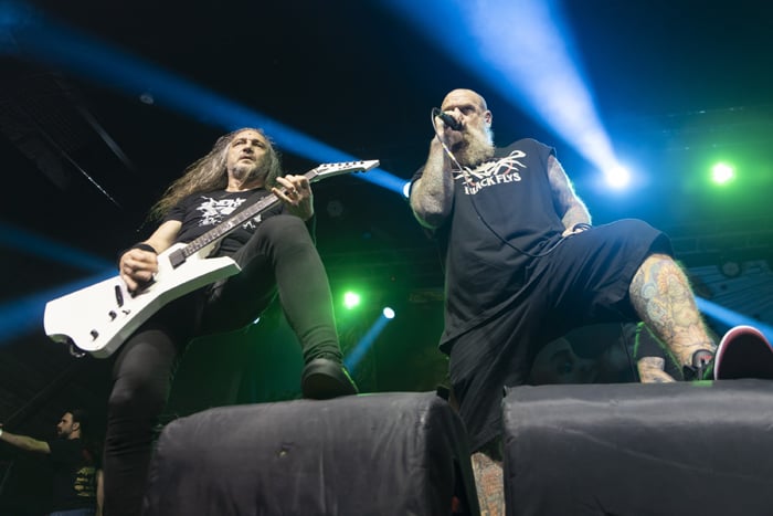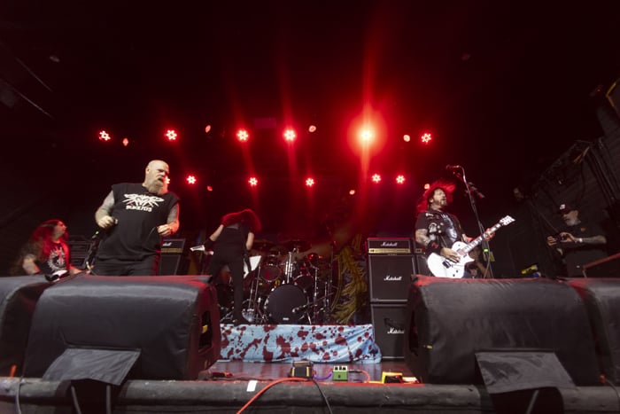A banda foi subir ao palco às 21h, para uma casa que encheu muito e rapidamente. Quando Gary Holt e companhia subiram ao palco, com os gritos da plateia, para o estrondoso sucesso "Bonded by Blood". Os fãs cantaram muito, puxando o refrão junto com Dukes, e o mosh pit começou fervendo desde a primeira música, para delírio do público.